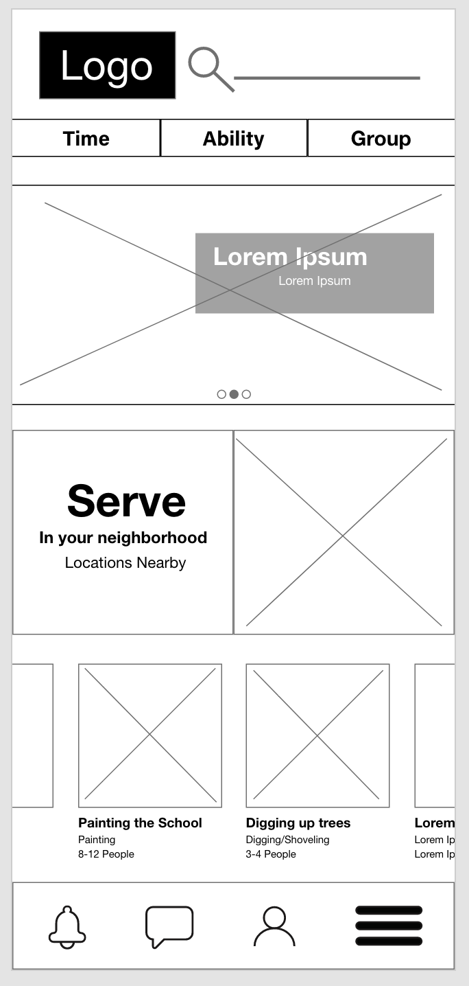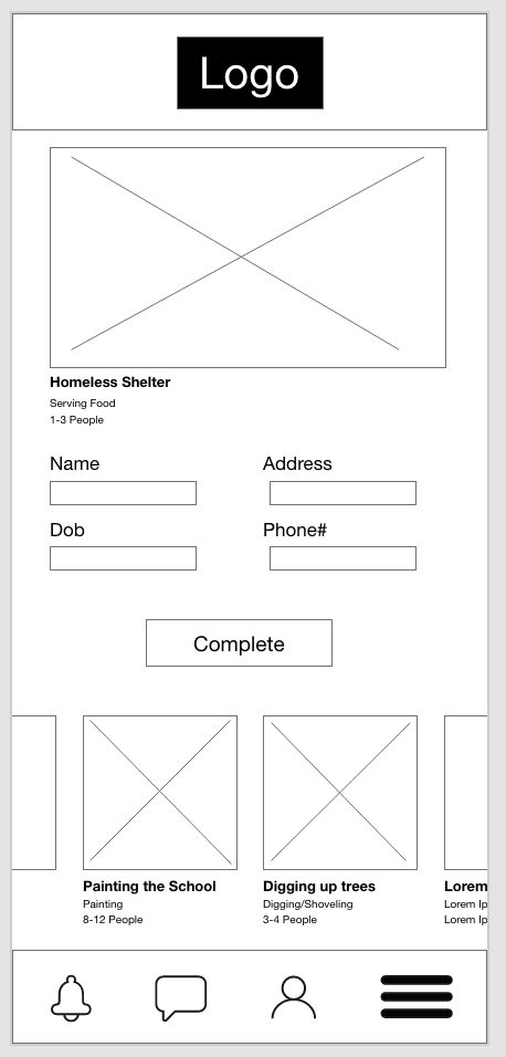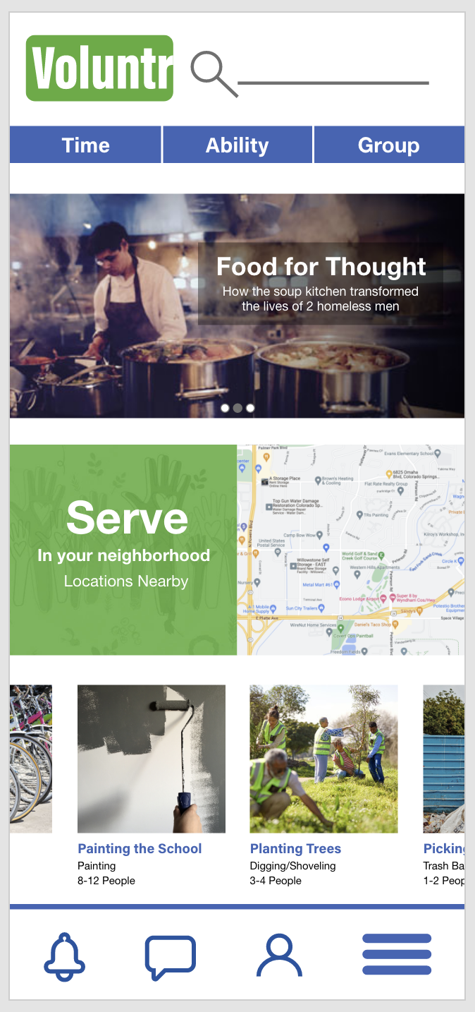 After ideating and drafting some paper wireframes, I created the initial designs for the Voluntr App. These designs focused on helping easily locate local places to volunteer at.
