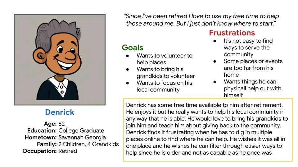 Denrick is a retired senior citizen who needs a convenient method to volunteer locally because he wants to show his grandkids how important helping others can be