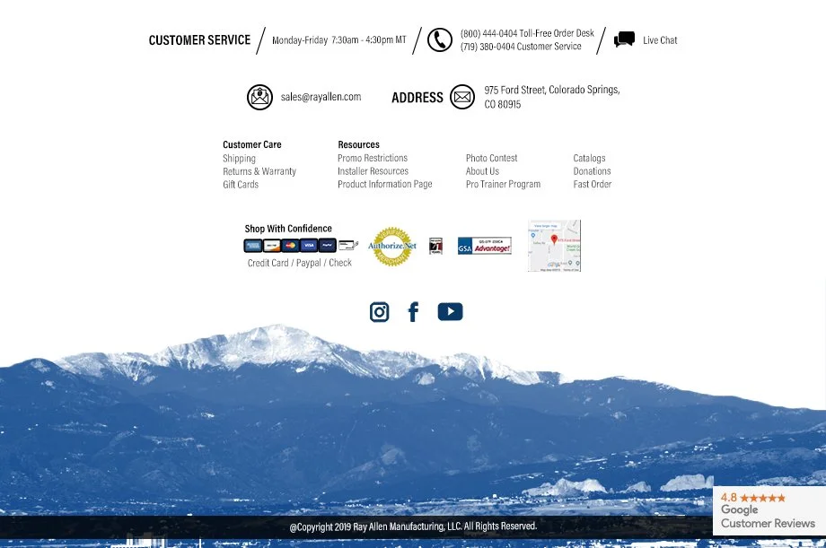 This section has been crafted to incorporate the fundamental yet subsidiary components footer. Positioned beneath the site links, a distinctive element resides. Ray Allen Manufacturing is based in Colorado Springs, CO. The image features the sacred Pikes Peak and it serves as a visual representation of the companies hometown. The peak offers a breathtaking panorama of the entire city spanning for countless miles. This inclusion has been purposefully devised to reinforce our brand's status in the USA, paying an honorable tribute to the environment in which our valued staff call home.